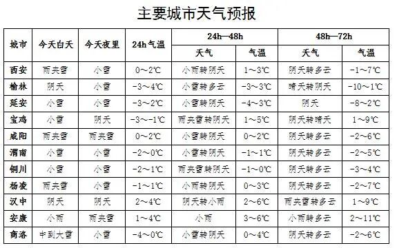 今天晚上:全省阴天,陕北、关中大部、陕南东部有小雪,陕北东部部分、关中东部部分、陕南东部部分地方有中雪。秦巴山区局地有冻雨或冰粒。